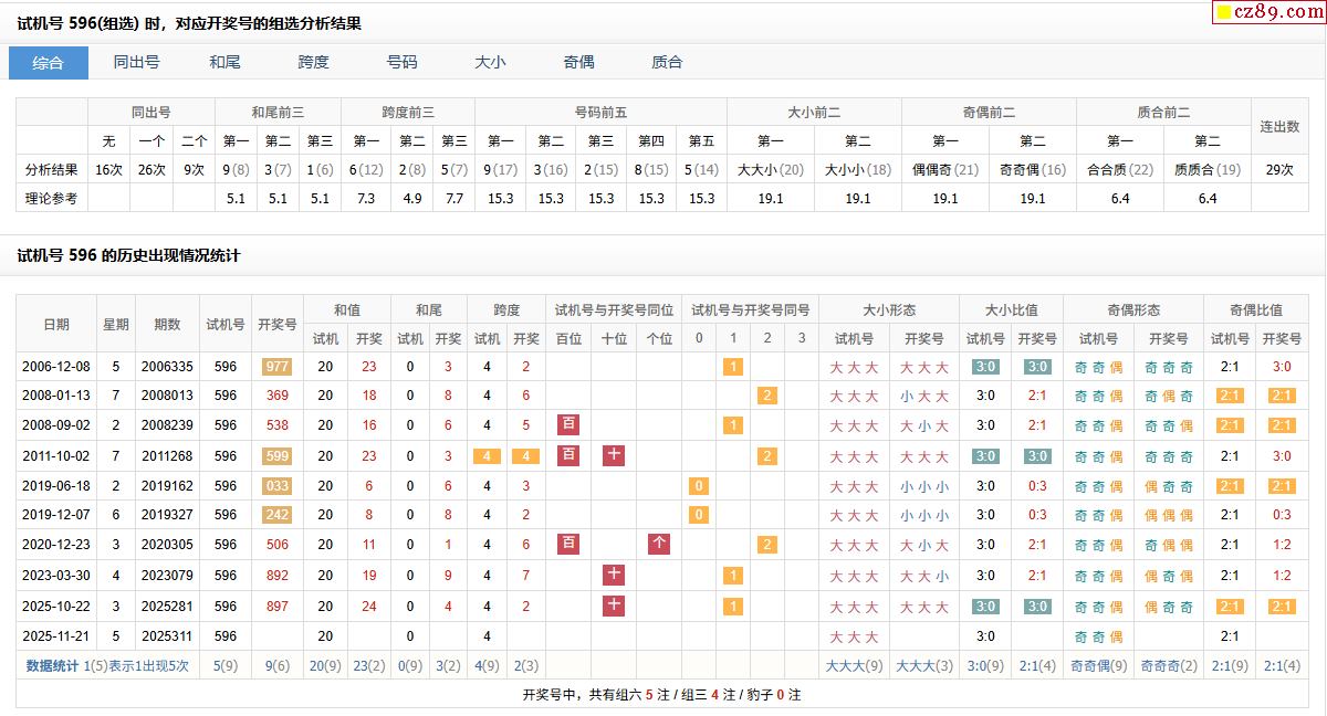 > 311期福彩3D试机号596对应开奖号的组选分析结果
